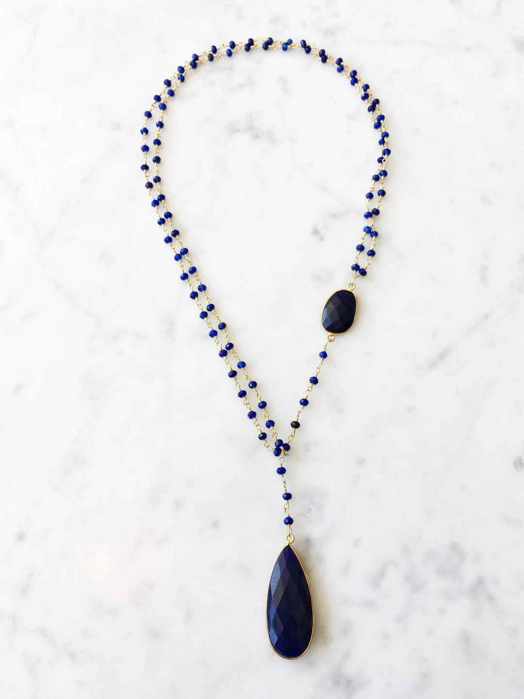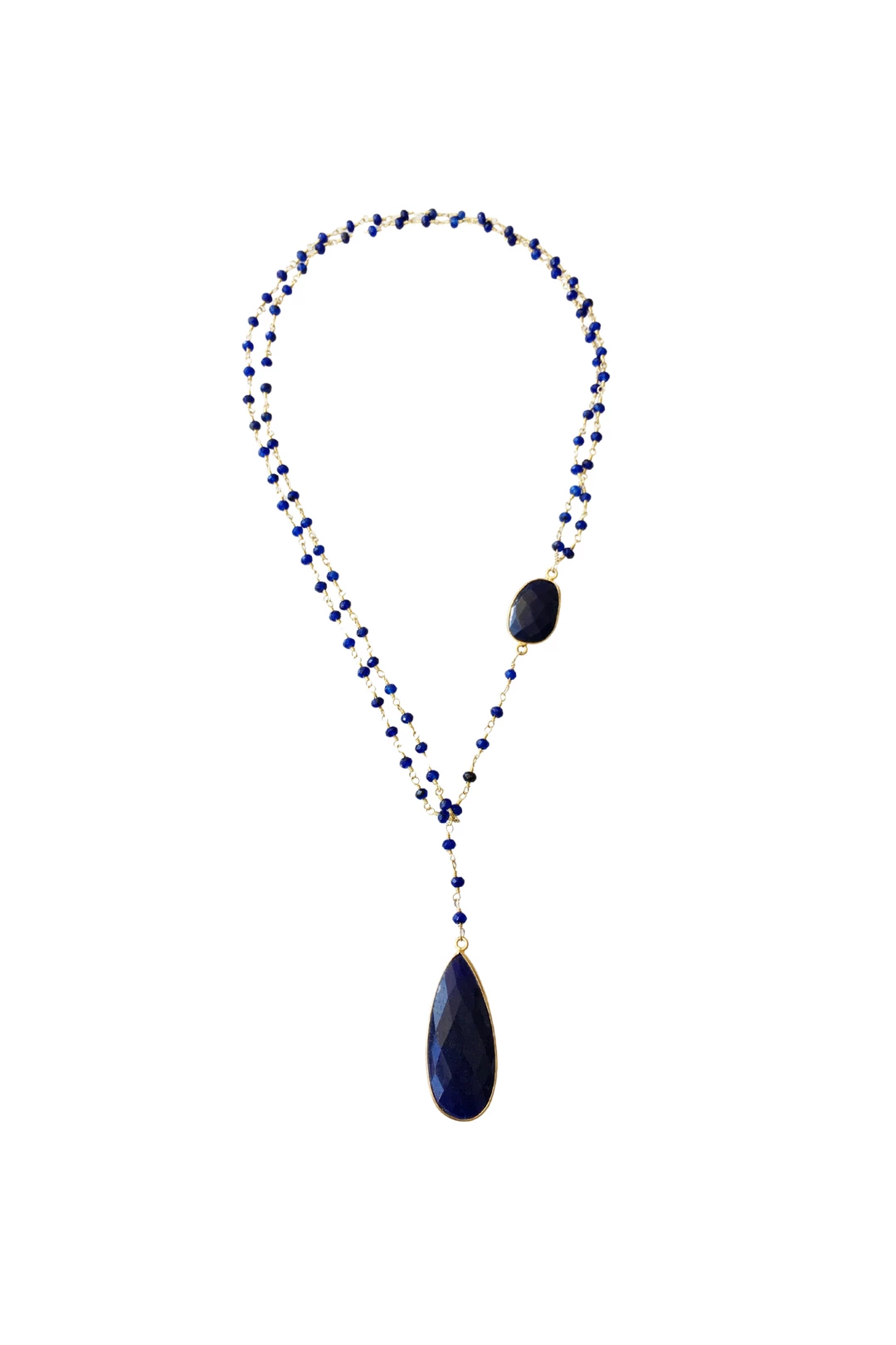 A gold and semi-precious sapphire beaded chain necklace with a round semi-precious sapphire stone set in an 18k gold vermeil bezel, cascading down to a teardrop-shaped semi-precious sapphire stone pendant set in an 18k gold vermeil bezel.