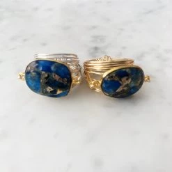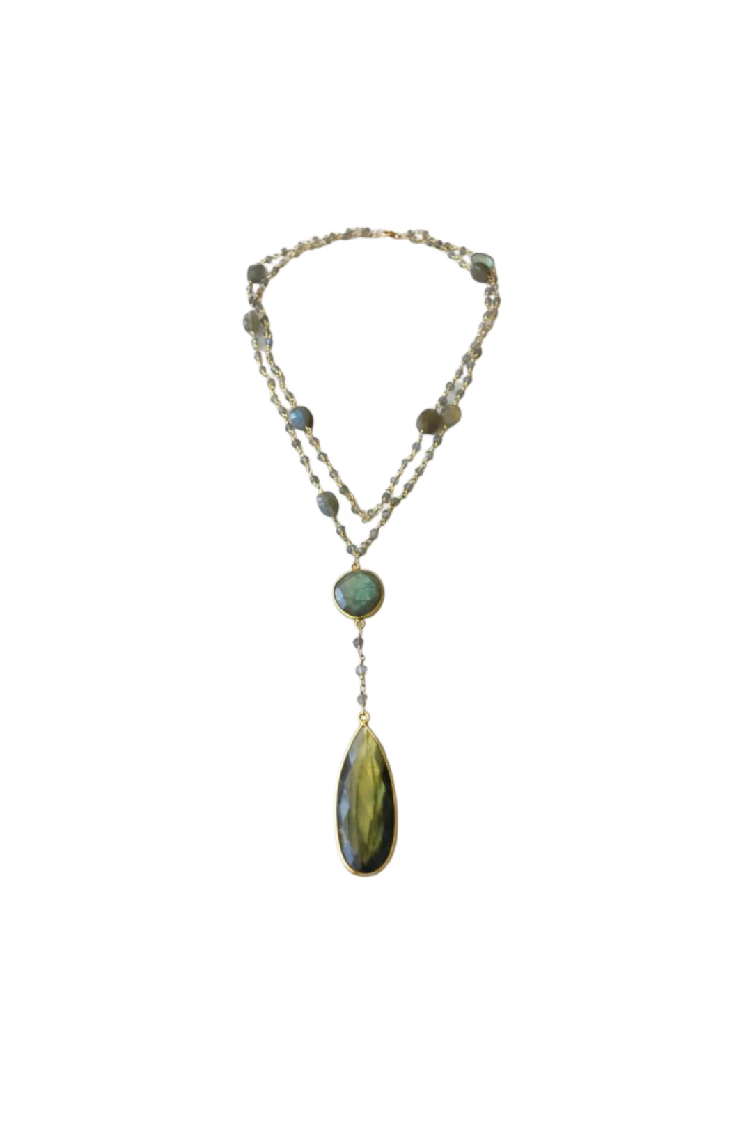 A 16″ gold and semi-precious labradorite beaded chain necklace with a second 17″ gold and semi-precious labradorite beaded chain necklace with a round semi-precious labradorite stone set in a 14k gold vermeil bezel, cascading down to a teardrop-shaped semi-precious labradorite stone pendant set in an 14k gold vermeil bezel.
