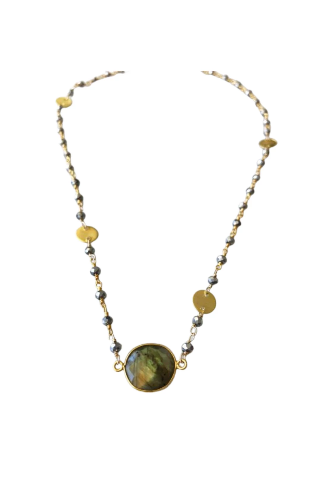 A semi-precious labradorite stone set in a 14k gold fill bezel sitting on a semi-precious polished pyrite beaded gold coin chain with a 14k gold fill clasp.