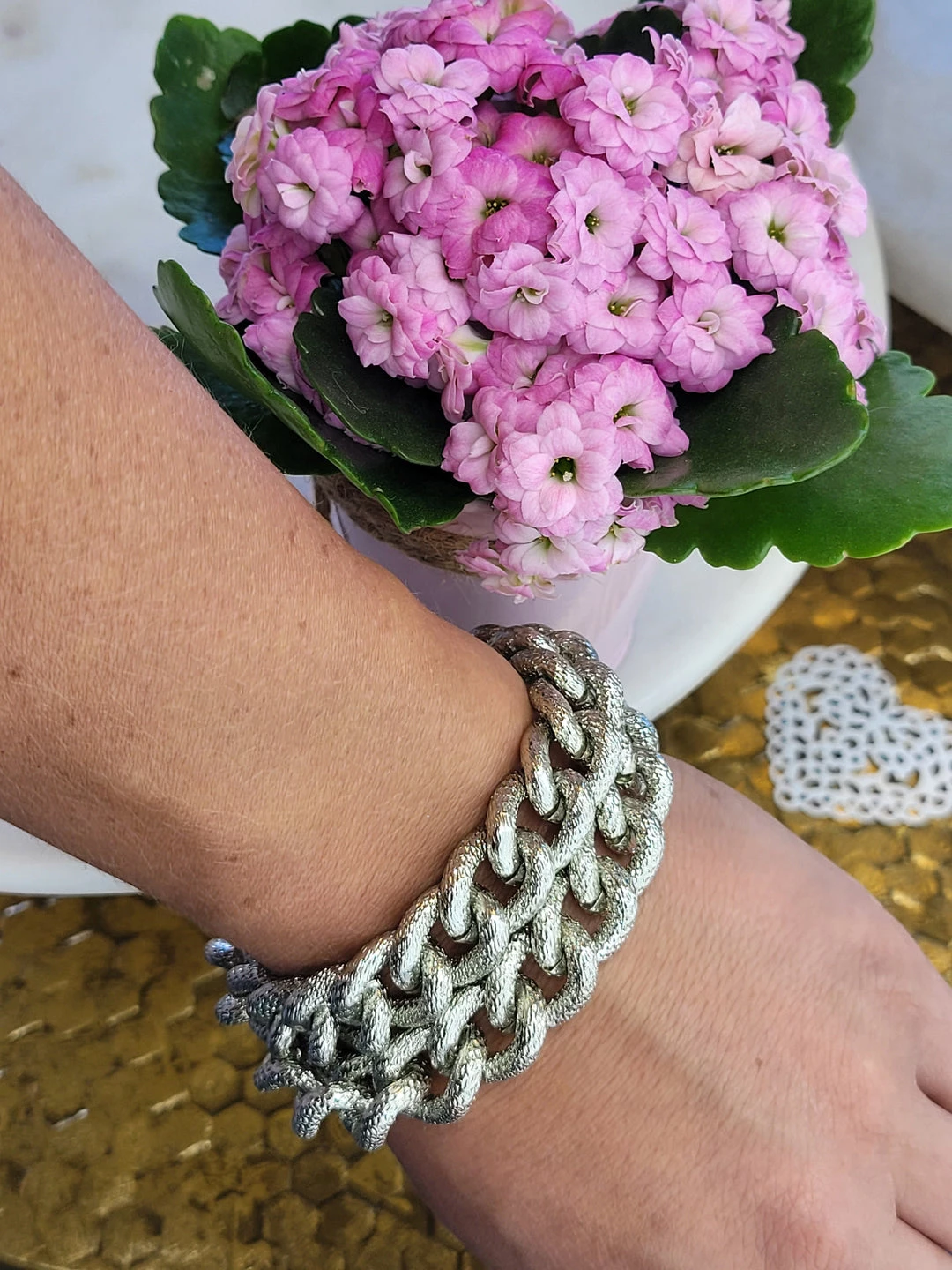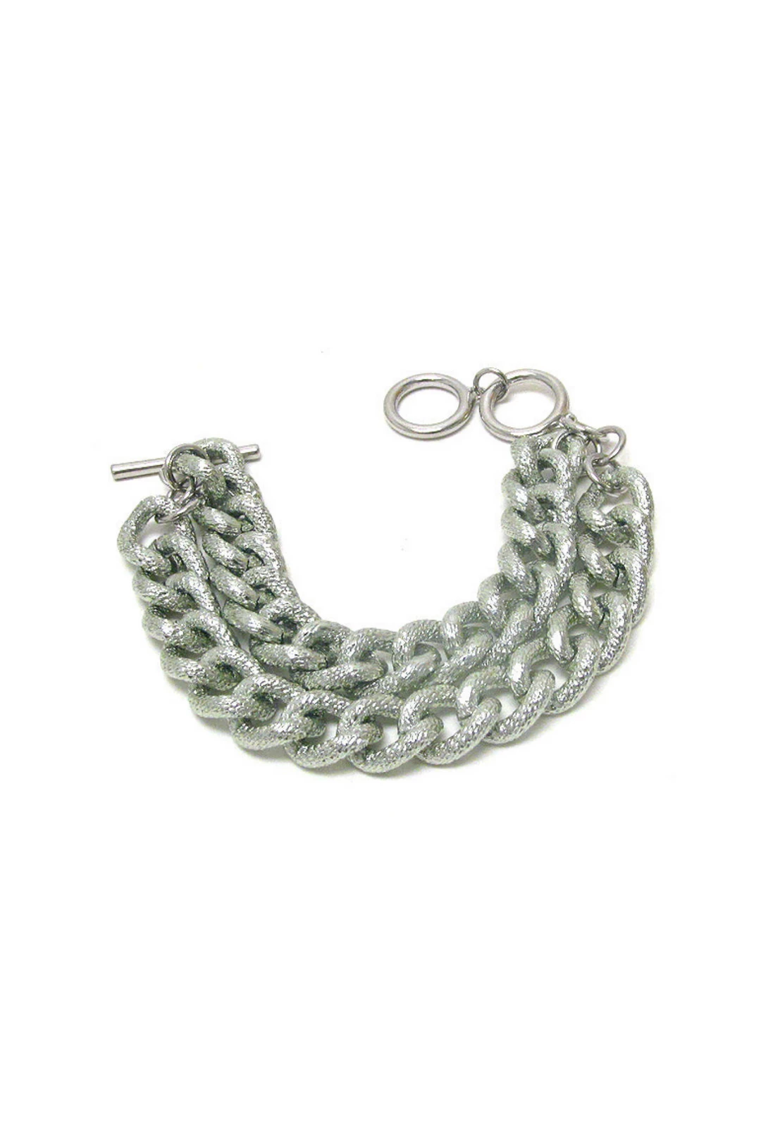 A textured silver double thick metal chain bracelet with a toggle clasp.