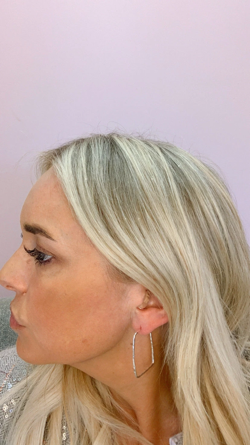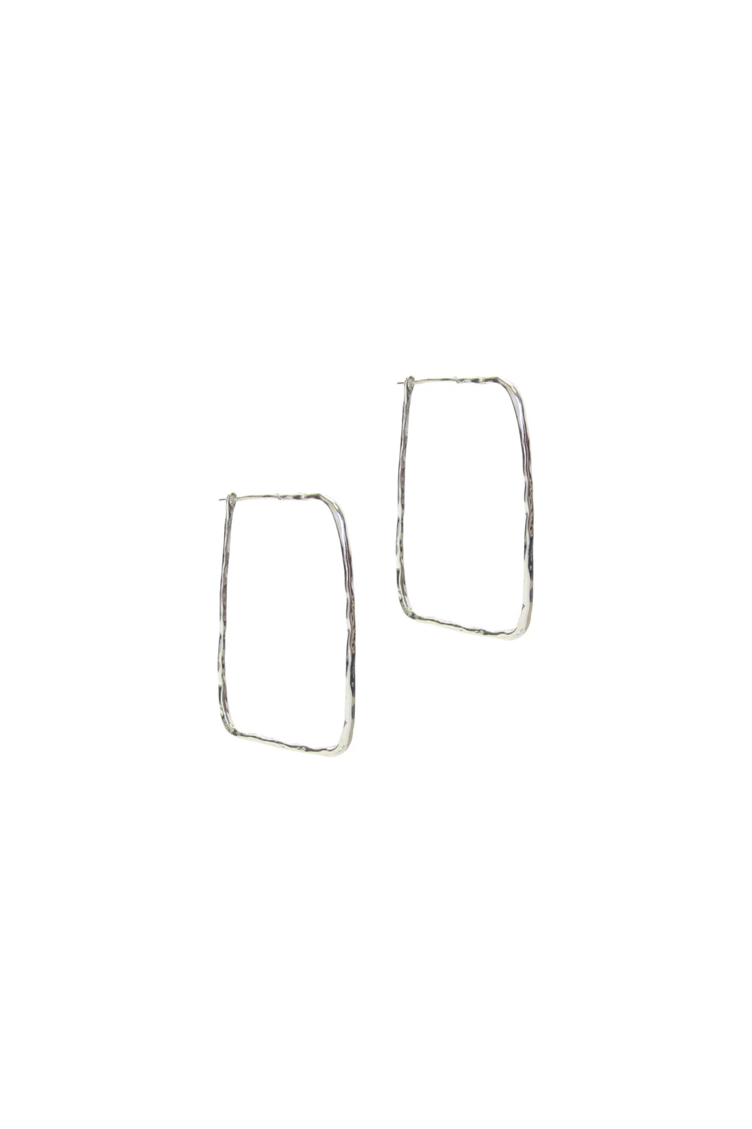 Hammered silver rectangular hoop earring.
