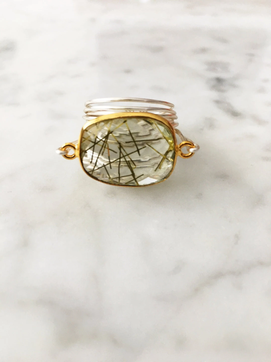 Available in your choice of wire, with a 14k gold bezel set semi-precious gemstone. These rings will vary slightly due to the individual nature of the stones which are semi-precious and unique.
