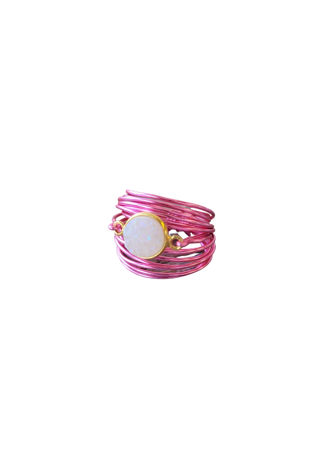 Available in hot pink over copper wire, with a 14k gold bezel set semi-precious gemstone. These rings will vary slightly due to the individual nature of the stones which are semi-precious and unique.