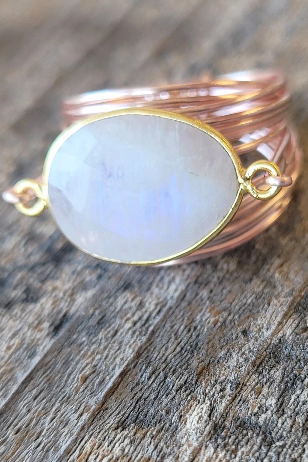 Available in rose gold over copper wire, with a 14k gold bezel set semi-precious gemstone. These rings will vary slightly due to the individual nature of the stones which are semi-precious and unique.