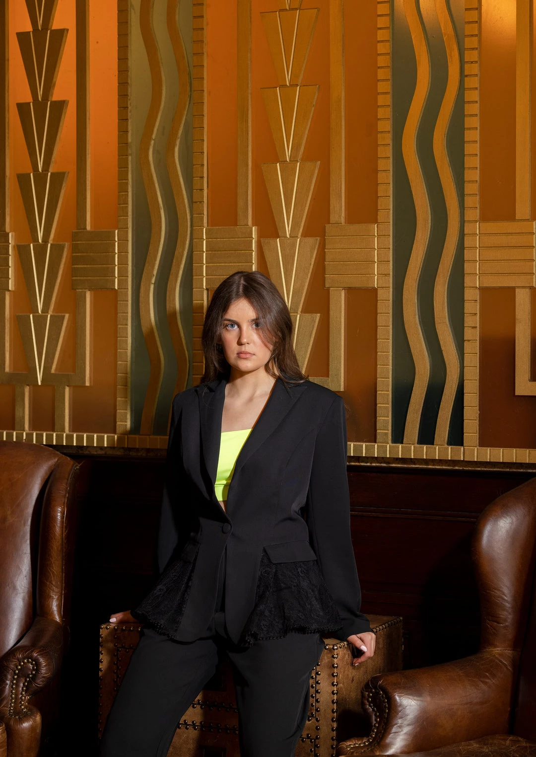 This highly sophisticated Freja blazer is crafted from soft fabrics covered in delicate lace. A fully detailed piece which creates a high impact look.