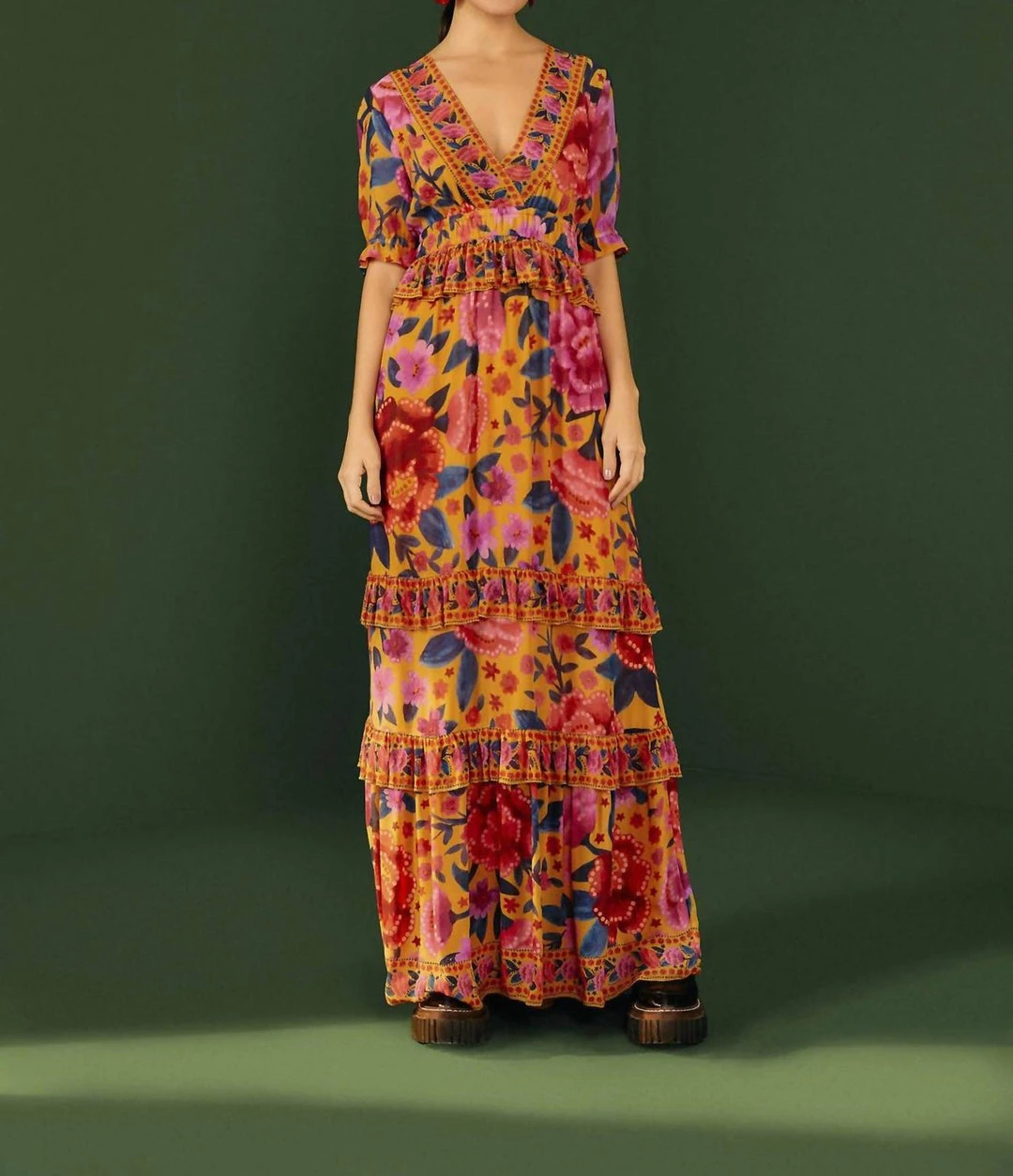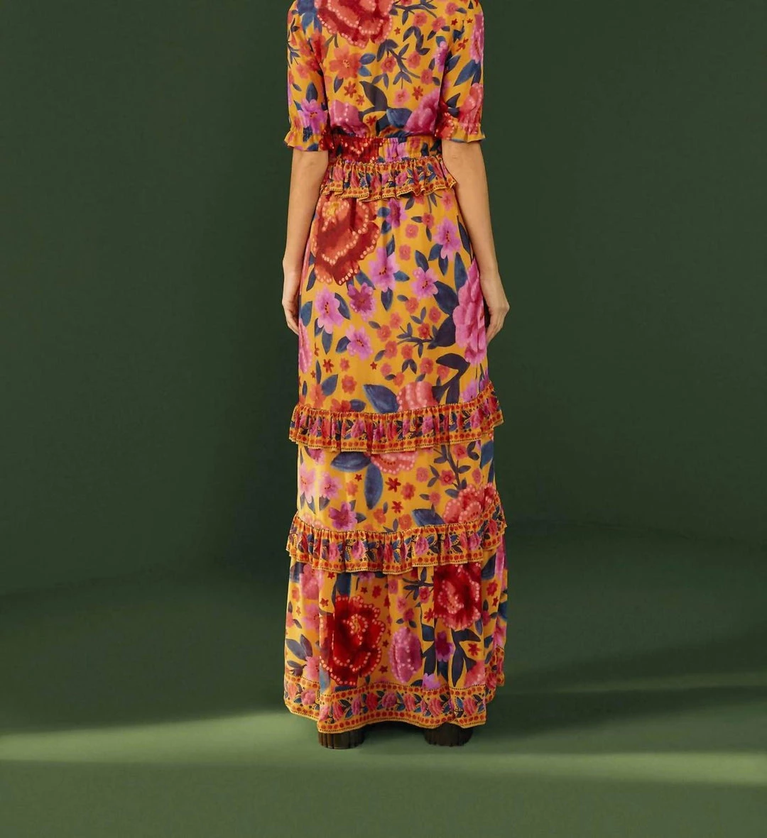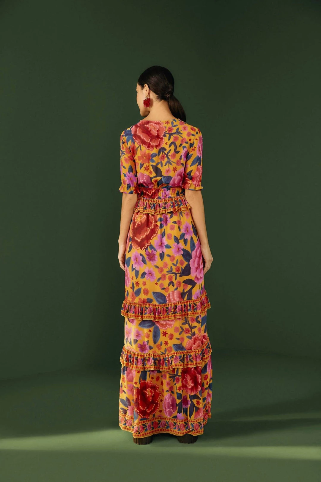 With a plunging neckline.• Easy fit• V neck• Elastic waistline• Short sleeves• Ruffled detailing• Layered skirt