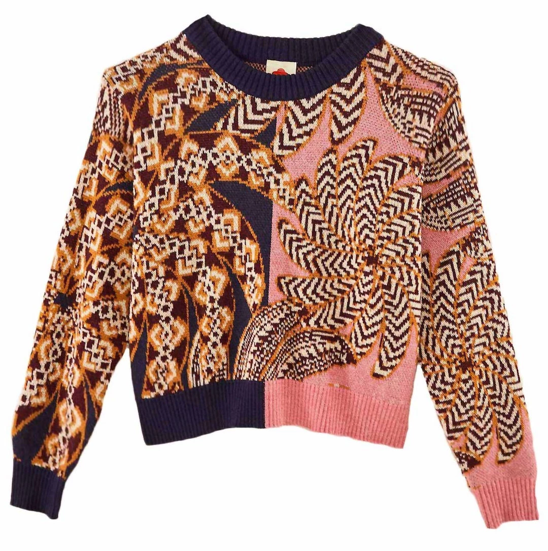 Let this light wool sweater take you from day to night and every temperature in between while looking your best. Stunning shades of pink, plum and navy inspired by prints from the native Yawanawa tribe in Brazil
